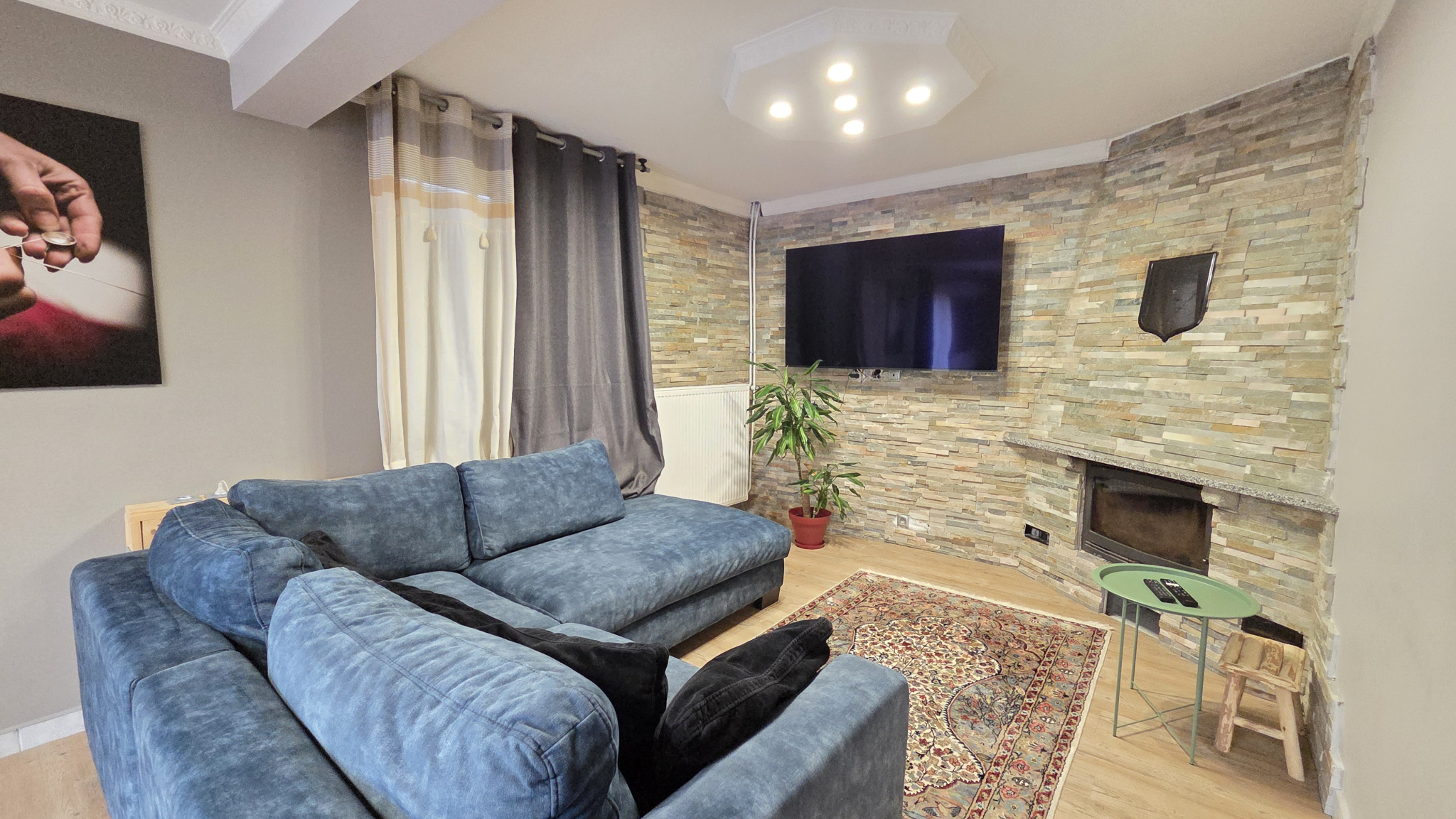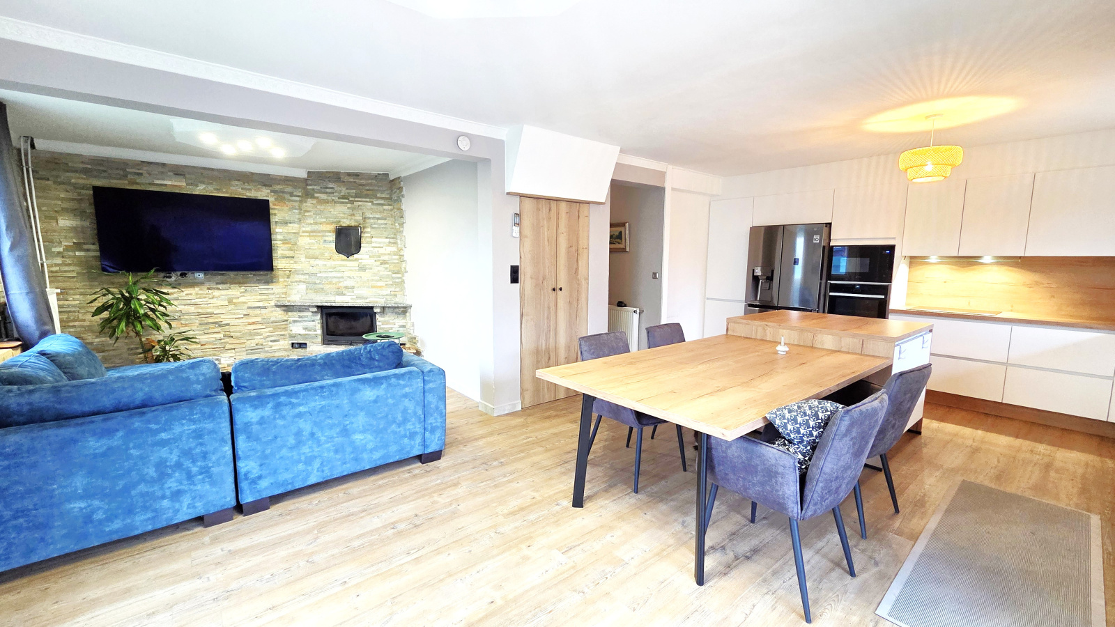 Une cuisine aménagée et équipée, ouverte sur un séjour lumineux et chaleureux, agrémenté d’une cheminée avec insert